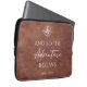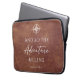 冒険スタイリッシュをテーマにした茶色の革のパーソナライズされたラップトップスリーブ。このデザインは、白いコンパスと引用文を持つ洗練された茶色の革のプリントの背景を見てやる気を起こさせる、"そして、冒険が始まる"。自分の名前でパーソナライズして自分の名前にする。