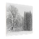 黒と白の写真が穏やかな冬の風景を写している。雪に覆われた大きな裸の木が目立つが、その枝が伸びてい離れる。右はラデン松の鬱蒼とした森が織り成す。地面は雪の毛布で覆われ、草が覗き込む微妙なヒントがある。