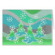 霜のモダン降った松の木と雪の結晶を持つ、様式化された冬のきらめく風景。グリーン、ブルー、シルバーグレーとホワイトのカスタマイズ可能なデザインを備えたグリーティングカードは、独自の文字、画像、アイディアでパーソナライズする。Jess Perryによるデジタルで強化された色の鉛筆スケッチ。