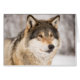 写真冬の森の中で大きなオオカミのクローズアップ。可愛いフレンドリースマイルの顔。茶色、白、黒の毛皮。宇宙は手書で中に入れる。
