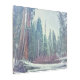 この画像は穏やかな冬の森の風景を捉えている。そびえ立つ常緑樹は、雪で覆われた木々が曇った空に向かって届く。雪に覆われ落ちたた大きな木の幹が前景にある。緑や茶色、白が中心のカラーパレットで、落ち着いた雰囲気をクール醸し出している。赤みを帯びた茎を持つ小さな茂みが中盤に見える。