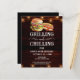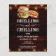 グリルと冷却誕生日招待状。パーソナライズする簡単。すべての文字は調整可能で、簡単は自分のパーティーニーズに合わせて変更できる。文字列ライト素朴な背景要素。おもしろいシャルボードは渦巻き旋回し、繁栄する。水色ハンバーガーとホットドッグのグラフィック。招待状だ。バーまたはバックヤードBBQ誕生日デザイン。年齢は、単に文字を変更。