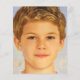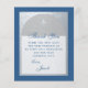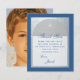 少年用 青い初めての聖体拝領 サンクスカード。クラシックな青い長方形の背景に、銀の箔押しアーチがあり、その中には白い背景に青い文字が入っています。「ありがとう」や名前は優雅なカリグラフィーで書かれ、他は大文字で表示されます。 裏面には、Pixabayからの少年写真のプレースホルダがあり、コンピューターで生成された画像(実際の人物ではない)で、商用利用が可能です。