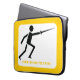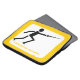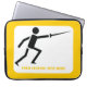 剣を持つフェンサーの黒いシルエットのミニマルなピクトグラムアイコンと黄色の白い背景にあなたのテキストを表示するフェンサー黒シルエットフェンシング縁どラップトップスリーブ。これカッコいいは、モダンデザインはテンプレートであり、完全にカスタマイズ可能である。