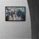 ブルー鮮やかス、オレンジ、ブラックの混はっきりした合を持つ抽象芸術スタイルで街のスカイラインが描かれている。動的なブラシストロークと幾何学的な形状は、動きと複雑さを作り出す。