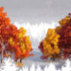 広大な白い雪の背景の秋のイラストレーションと遠くの山や木々のシルエット。山や木々が地平線に広がり、穏やかな静かな雰囲気を醸し出している。地面はオレンジ鮮やか色と黄色離れので覆われポップ・アートの、シーンに色を加える。