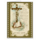 制されたイエス・キリストは十字でつるします。 十字の下で数珠のビーズはの開いた聖書そして一組あります。 背景に花および雲があります。 カードの端にエンボスの金ゴールドのfiligreesがあります。