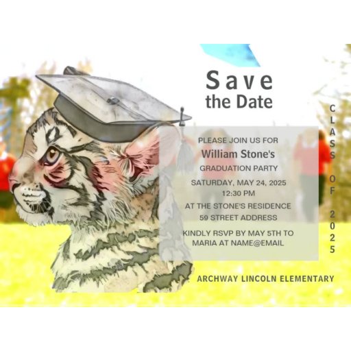 3枚のカスタム写真を使用して卒業名カードを作成お気に入りのする。タイガーグラードデザイン前面。大学院の詳細は、3枚の写真の宇宙と一緒に背面にある。テンプレートを使用してパーソナライズ卒業名写真付き名刺。
