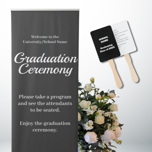 卒業式スケジュール ゲストプログラム - 夏の卒業式にぴったりな、ゲストが涼しく過ごせるカスタム卒業式プログラムを作成。学校のロゴや校風をアピールできます。高校または大学の名前、卒業年度、式典の詳細を追加できます。