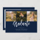 卒業式4フォトコラージュの脚本ネイビーブルースクリプト発表カード。簡単にカスタマイズこれは、文字を変更し、あなたの写真に置き換える。今年モダンの卒業を発表するトレンディーな方法!