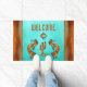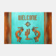 この"種類ユニークの1つ"南西ココペリのDoormatをパーソナライズ! 2つの銅ココペリの遊フルートとターコイズの背景にのまわりに太陽の下の踊りサボテンを備え…銅に囲まれ!アーティスト・ケリー・ミラーによるオリジナルアートデザイン。