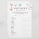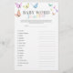 この可愛い"単語スクランブル"赤ちゃんシャワーゲームで思い出す'ママの'シャワーを1つ作成!の白シンプルい背景、水色のパステルレインボー色の蝶、編集可能な文字テンプレート。逆の部分に下降筋がある。