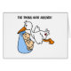 愛らしい対のデザインのTシャツ、マグ、トートバック、ボタンおよび"双生児読む2つの微笑の男の赤ちゃんおよび文字が付いているお守り毛布を運んでいるこうのとりを特色にする他の対項目は!"を着きました。