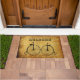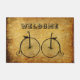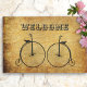 カップルのためのヴィンテージデザインとウェルカムマット。パーチメント紙の背景イメージの上に2ペニー動揺してファール自転車が印刷されている。「ようこそ」文字は黒のオープンレターフォント。この古いユニークサイクリングファッションドデザインは、アクティブな自転車に乗るカップルに最適である。