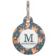 可愛パーソナライズされたくてハッピーなオレンジキツネで模様を描いた犬ラベル。濃い緑の背景。小さなキノコ葉やが撒いた名前とモノグラムのイニシャルを内側に重ねて白い円。