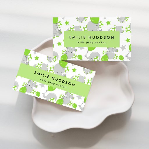 ゾウや風船、星が付いた可愛くておもしろいで愛らしい名刺。そしてモダントレンディーデザイン、完璧なセ子供へン遊ト、遊び場、アクティビティの中心、子ども、気にbabysitter、nannies。