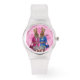 ピンクのおもしろいヴィンテージダマスクの背景にドレスの可愛いバニーのウサギの女の子のキャラクターは、オコナルトによって。ご希望の数字/数字を削除もしし、ウォッチスタイルとストラップ色の幅広い選択肢から選択して、このデザインをパーソナライズすることができる。VINTAGEPRINTS STOREにアクセスして、かわいい動物のおもしろいキャラクターデザインにマッチ。