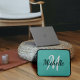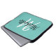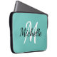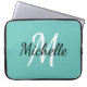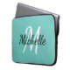 軽いモダンティール(緑がかった色)の青い背景と白いモノグラムの最初のイニシャルと名を持つノートパソコンケース。