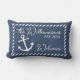 白い航海のいかりと模様の美しいテーマの縁ど腰枕ストライプの。家族の姓カスタマイズ名と選択の定年の日付でパーソナライズする余地がある。様々なデコーモダンルのアクセントとファッションアクセサリーで利用可能なホームパテインスパイアオ、ポーチ飾、またはプールデッキ屋外宇宙。