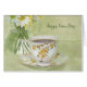 お茶ファッションドと名前の日のためのデイジーの花束とソースの古いティーカップ