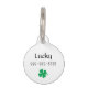 より暗い緑の背景の幸運な緑4の葉のクローバーを特色にするペットタグ。 のまわりで放射状の点が付いている緑および白いボーダーはあります。 背部のカスタマイズ可能な名前そして電話番号。
