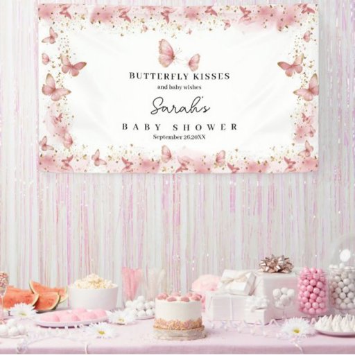 エレガントなピンクの蝶のベビーシャワーバナー。お名前、日付、メッセージをカスタマイズできます。女の子のベビーシャワーパーティーの装飾に最適です。