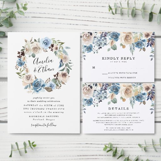 洗練されたフラワーテーブルナンバーカードは、優雅な白、ベージュ、青の水彩画の花を上部と下部の緑豊かな葉でフレーミングし、テーブルの番号、名前、結婚式の日付を両側に添える。フラワーテーブルナンバーカードは、当社のBlooming Beautyウェディングコレクションに合わせてデザインされている。カートにテーブルナンバーカードを個別に追加してください。
