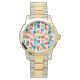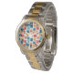 このメンズウォッチは、タンゲリン、ケシ、サンゴ、ティール(緑がかった色)の色合いを含む正方形の幾何学的デザインを持ち、輪郭と共に散らばっている。