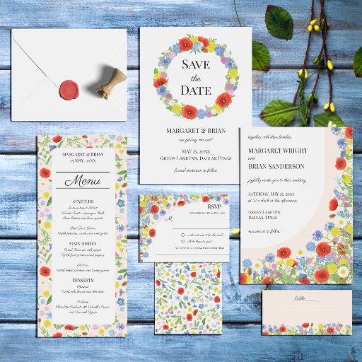 水の色素朴国フローラシグネチャー結婚のゲストブックは、庭をテーマにした春や夏の結婚式に最適である。カラフルデザインは、デイジー、ポピー、コーンフラワー、クローバー、ブルーベル、私ではないと、チコリーやタンポポなどの野生の花の水色のパターンを特徴とす忘れる。名前と日付を追加して、前面カバーと背骨をパーソナ結婚ライズする。一致するアイテム結婚については、私のワイルドフラワーカントリーのウェディングコレク素朴ションを参照してください。