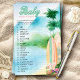 ベビーの単語スクランブルゲームシート、編集可能なゲームの指示 – あなたの赤ちゃんシャワーで遊おもしろいの単語のパズルゲーム。サーフボードとレトロなタイポグラフィと夢のようなビーチシーンとゲームカード羽毛の水色デザイン。赤男女兼用ちゃん女の子や男の赤ちゃんのためのルアウ(ハワイ式宴会)、サーフィンまたはビーチをテーマにしたベビーシャワーのためのテーマ。