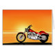 海に立つハーレーに似たバイクで、オレンジ色の夕日が輝く。サイクリング素晴らしやオートバイが好きな人のためのギフト。私の店で年齢や人間関係のためのカードの全範囲を参照しなさい。すべてのアートワークの著作権Norma Cornes