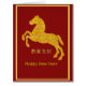 旧正月、馬の年を祝う大きい挨拶状2014年。 挨拶の内部は名前入りかもしれ、この大きい挨拶状に2014年の繁栄のそれ以上のメッセージを加える沢山の宇宙があります。 カードカバーはえんじ色の背景に対して金ゴールドのはすの花のパターンとしてシルエットを描かれる馬を特色にします。