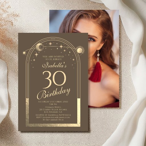 天のモカ金ゴールド太陽の月天文学30th誕生日招待状は、モカの背景にエレガント金ゴールドの太陽、月と星の黄金のフレームを備えている。あなたの30歳のカスタム誕生日の招待状の情報の中にある。文字・ボックスで文字を編集してパーソナライズEvco Studio www.zazzle.com/store/evcostudioによるユーザー向け設計