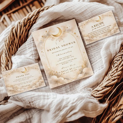 輝く黄金の三日月がエレガントなアーチ型のフレームにセットされた、夢のような天体デザイン。柔らかな光を放つ雲、繊細な星の輝き、そして温かいシャンパン色のトーンが、ロマンチックで幻想的な雰囲気を創り出します。微妙な大理石のような背景と洗練された金のディテールが、深みと洗練さを加えながら、柔らかな空気のような輝きを保ちます。現代の天体魔法を愛する花嫁にぴったりで、洗練された、時代を超越した美観を備えています。