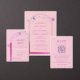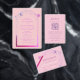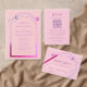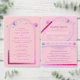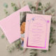 神秘的な紫の金ゴールド太陽の月の星天文学の天文学銀河系宇宙ウェディングカードは、ピンクの背景にピンクと紫のフレームを持つ太陽、月、星を特徴とし、ピンクの書道台本の中央にあなたのメニュー詳細をモダン持つ。提供されている文字・ボックスで文字を編集してパーソナライズ。Evco Studio www.zazzle.com/store/evcostudioによるユーザー向け設計