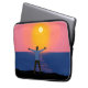 太陽への挨拶。男はビーチの上に開いた海に向かって立ち、腕を上げて黄色い太陽に挨拶している。