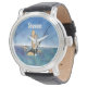 超現実的で奇妙な状況の漁師の漫画のイラストレーションをフィーチャーするこのおもしろいの新しい時計をパーソナライズ。名前を付けたり、ギフトとして他の人の名前を付け与えたりして!美しい青い水と空の背景は、このデザインの周りにおもしろいと美しいデザイン。このおもしろい漫画魚釣りテーマは釣り人に最適である。