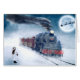 蒸気機関車に乗る準備をするそりを持つ女の子そしてサンタが付いている真夜中のクリスマスの列車。  frontiernow.com