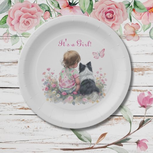 女の子のピンクとセージグリーンのベイビーシャワーの招待状。かわいい赤ちゃん女の子が、かわいい黒と白のミニオーストラリアンシェパードの子犬と一緒に、きれいな水彩の花のパッチに座っています。ピンクとセージグリーンの蝶と、かわいい野の花。