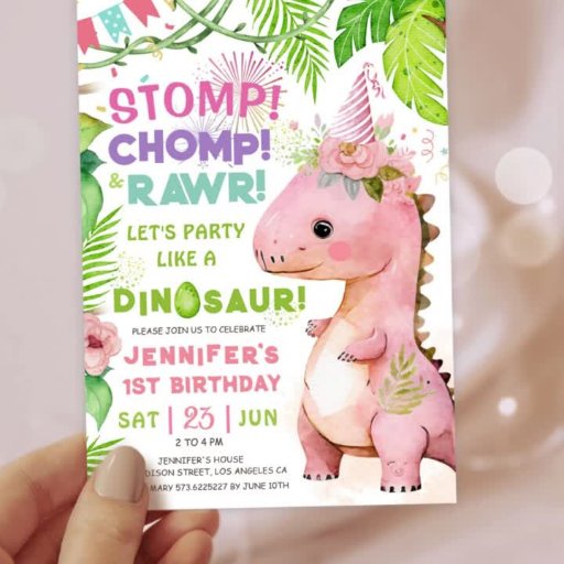 女の子の恐竜1st誕生日パーティーかわいいピンクDino 招待状