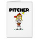 金髪を搭載する棒の姿の女の子の野球選手および野球の赤い野球のユニフォームはTシャツ、マグ、トートバック、カードを、および"水差し"を読んだ多くを設計します。
