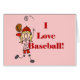 赤と白の野球のユニフォームの女の子が野球選手および赤い文字"私を読む野球"を愛する女の子I愛野球のTシャツ、マグ、カード、郵便料金、ステッカー、野球の磁石、トートバック、フード付きスウェットシャツおよび金髪の棒を特色にする他の野球の服装およびギフト項目は計算します!