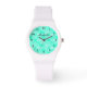 女性のためのデジタルアクアブルーピクセルパターン時計。ミントパーソナライズされたグリーン/ターコイズブルーのモザイク模様の腕時計のための女性。トレンディーモダンファッションプリント名前をカスタムするまたはモノグラムスタイリッシュ。女性と女の子のためのキュートな誕生日またはクリスマスギフトのアイディア10代の。母、母、娘、妹、叔母、妻、ガールフレンドなど自分で作りなさい。背景色は変更可能。シックエレガントスクリプトタイポグラフィ。