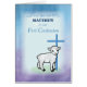 羊は、少年の最初の告白として、このカトリックの祝い祝カードの上の青い十字の前にある。カスタマイズ可能なカードを使用すると、First Reconciliationに実際のキープザーの名前を追加できる。