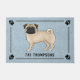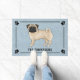 可愛らしい子犬のオリジナル漫画イラストレーションPug種の犬のデステイ。犬が立って見る人の方を見ている。尾は犬の背中の上でカールしている。体の色は明るいベージュだが、犬の耳や鼻、目に暗い詳細が付いており、子犬の色のPugsに知られている「黒いマスク」の外観を作成している。犬の尾の先に暗い影もある。犬の口は閉じられ、目の色は茶色である。背景色は青で装飾的な質感を持つ。テクスチャを取り除き、背景色を他の色に変更できもしる。デザインは額に入れスタイリッシュて縁どいる。隅には犬の前足のプリントシルエットもある。犬のイメージの下には、例えば"welcome"などの家族名または他のカスタム文字用のパーソナル化可能な文字がある。