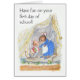 学校で彼の最初日の間引き起こすために家に去っていて小さいマウスが「学校であなたの最初日のおもしろいを」の挨拶状、持って下さい。 このデザインはJudyアダムソンによって手塗りの水彩画のイラストレーションからあります。 中メッセージを個人化できます。
