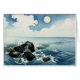 小島の島、大きい波。 日本人のWoodblockのプリント。 プリントは小島の島の海岸の石に衝突する波を示します。