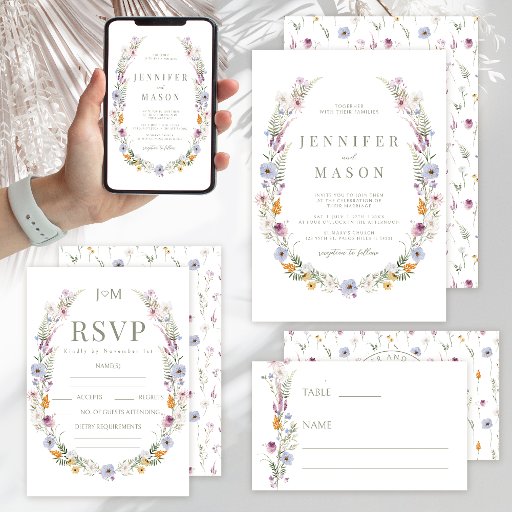 植物性エレガントの水色のカラフル野花、花嫁と新郎新婦モノグラムの庭や素朴な納屋の夏の紙のプレートと小さな花結婚。