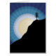楽しむカラフルグラフィックデザインは、山の上のディスクゴルフバスケットのシルエットを特徴とする。