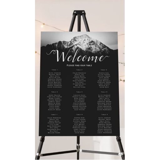 山の結婚下に白と黒。山に覆われた雪の風景の写真は下の暗闇と上の白い曇り空。夫婦の名前は空の山の上の黒いフォントにあり、すべての詳細は山の下の白いフォントにある。完全にカスタマイズ可能で結婚パーソナライズ可能な製品。